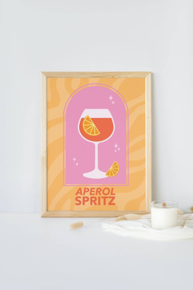 Breng kleur en stijl in je interieur met deze prachtige Aperol Spritz cocktailposter, beschikbaar in twee formaten. Ideaal om een vleugje flair toe te voegen aan je keuken, woonkamer of studentenkamer.